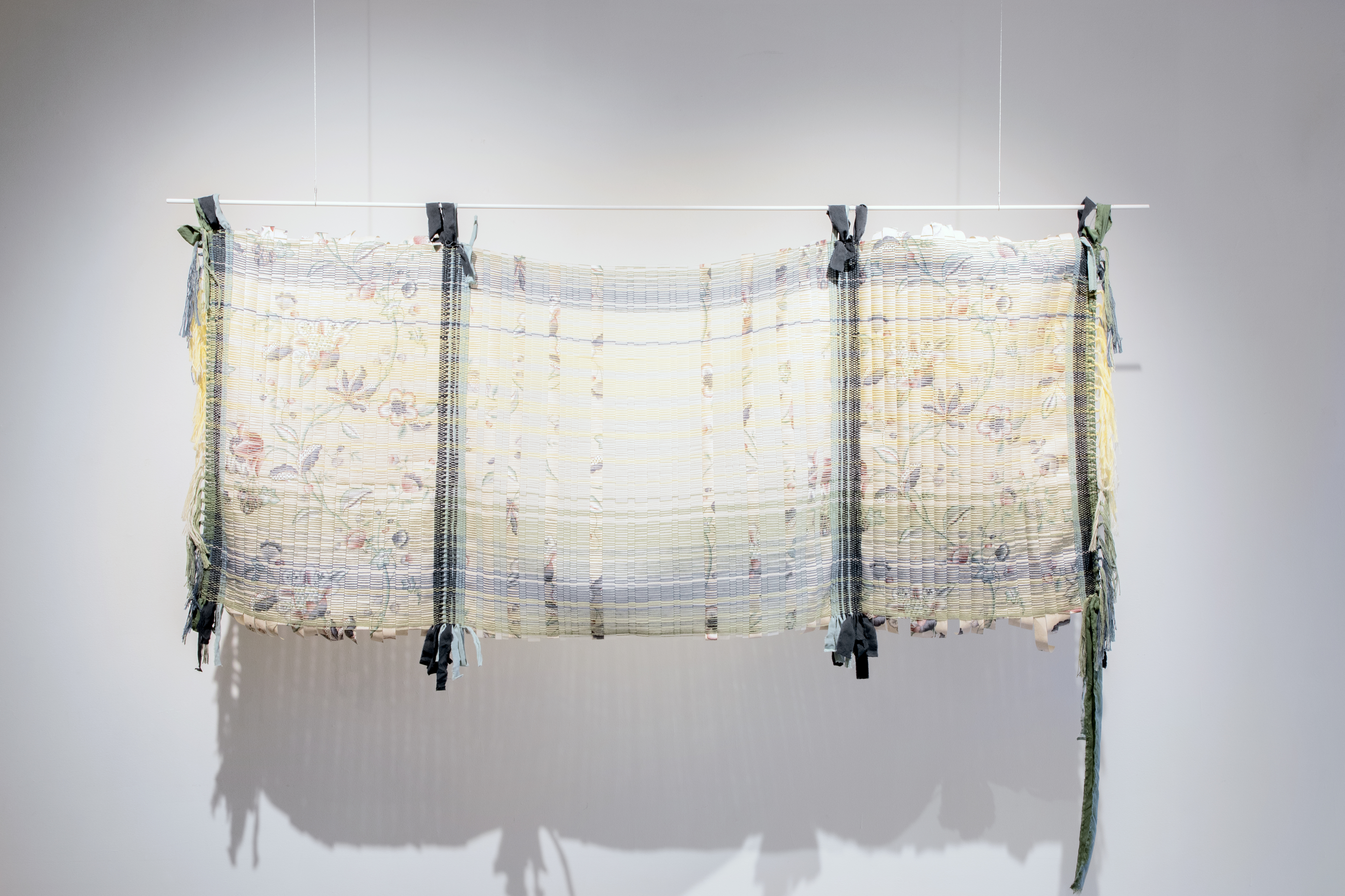 Weaving is rich with metaphors for life and heritage. In working with weaving traditional and non-traditional materials the past and present can exist in the same time frame. In order to weave something together on a loom you have to start with one material to be you warp first. This goes on to the loom, attached to all of the moving parts and threaded into all of the heddles. From there you prepare you material for the weft to weave over and under the warp. The time between these two layers separates them while simultaneously blends them into one piece. In this way, weaving is life. Our past experiences inform our present experiences. As we live through an event in the now, our brain immediately starts to process, categorize, and tries to understand the event, as it is happening. The only way in which it can do this is by drawing on what it already knows from the past. The memory starts forming right away, but as memory is only formed on what we know, and not what we don’t know, it is inherently faulty. The perception is one sided. To get more of the full understanding we would need to know what other around us are thinking and processing. Our feelings of place and home feed into our understanding of ourselves and those around us as well. Some people fully identify with one place as a large part of who they are as an individual, while others identify with multi places or even no place at all. Time, place, and experiences all combine in different ways to create the fabric that is our lives and our connections to others.